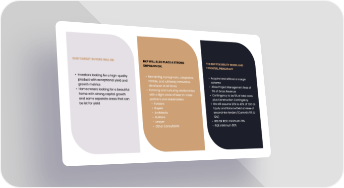 Our Target Buyers will be: BKP will also place a strong The BKP Feasibility Model and emphasis on: Essential Principals: Investors looking for a high-quality ; Remaining a pragmatic, adaptable, ; Acquire land without a margin product with exceptional yield and nimble, and ruthlessly innovative schem’ growth metric developer at all timeA ; Allow Project Management Fees of Homeowners looking for a beautiful ; Forming and nurturing relationships 5% of Gross Revenu’ home with strong capital growth with a tight circle of best-in-class ; Contingency to be 5% of total costs and some separate areas that can partners and stakeholderA plus Construction Contingenco be let for yield ; FunderA ; We will assume 20% to 40% of TDC as ; BuyerA Equity and Balance Debt at rates of ; ArchitectA second-tier lenders (Currently 6% to ; BuilderA 10%h ; Lawye= ; ROI OR ROC minimum 25ƒ ; Other Consultants ; ROE minimum 30%