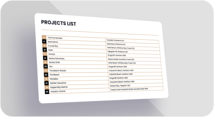 PROJECTS LIST 16 The Promenade Clayfield, Brisbane QLD 17 Manhattan Newstead, Brisbane QLD 18 Funnel Bay Airlie Beach, Whitstunday Coast QLD 19 Style Highgate hill, Brisbane QLD 20 Soraya Kingscliff, Northern NSW 21 Noosa Sanctuary Noosa Heads, Sunshine Coast QLD 22 Santai Airlie Airlie Beach, Whitstunday Coast QLD 23 Zen Kingscliff, Northern NSW 24 The Beach Shacks Casuarina Beach, Northern NSW 25 The Beach Cabarita Beach, Northern NSW 26 Paradiso Kingscliff, Northern NSW 27 Santai Casuarina Casuarina Beach, Northern NSW 28 Keppel Bay Marina Rosslyn Bay, Yeppoon QLD 29 Industry Central Tweed Coast Industrial Estate, Murwillumbah NSW