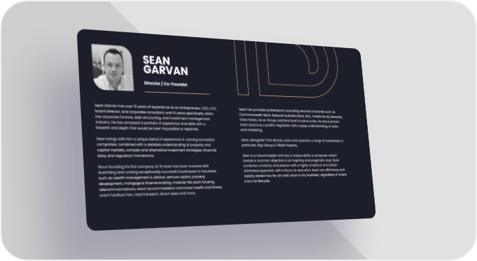 Sea渀 garvan Director / Co-Founder Sean Garvan has over 19 years of experience as an entrepreneur, CEO, CFO, Sean has provided professional consulting services to brands such as board director, and corporate consultant, and 14 years specifically within Commonwealth Bank, National Australia Bank, MLC, Vodafone, My Rewards, the corporate finance, debt structuring, and investment management Oaks Hotels, Accor Group, and Nick Scali to name a few. He has a proven industry. He has amassed a portfolio of experience and skills with a track record as a prolific negotiator with a deep understanding of sales breadth and depth that would be near impossible to replicate⸀ and marketing⸀ Sean brings with him a unique blend of experience in running successful Sean, alongside Chris Byrnes, owns and operates a range of businesses, in companies, combined with a detailed understanding of property and particular, Klyp Group & Offset Property⸀ capital markets, complex and alternative investment strategies, financial data, and regulatory frameworks⸀ Sean is a natural leader and has a unique ability to empower others toward a common objective in an inspiring and pragmatic way. Sean Since founding his first company at 19, Sean has been involved with combines creativity and passion with a highly analytical and detail- launching and running exceptionally successful businesses in industries orientated approach, with a focus on execution. Sean can effectively and such as wealth management & advice, venture capital, property rapidly assess how he can add value to any business, regardless of where development, mortgage & finance broking, modular flat pack housing, it is in its lifecycle. telecommunications, resort accommodation and travel, health and fitness, event furniture hire, road transport, direct sales and more.