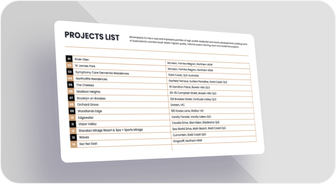 Brinsmead & Co has a vast and impressive portfolio of high-profile residential and resorts developments, building some PROJECTS LIST of Queensland’s and New South Wales’ highest quality, national award-winning resort and residential projects. 01 River Glen McLean, Yamba Region, Northern NSW 02 St James Park McLean, Yamba Region, Northern NSW 03 Symphony Care Dementia Residences Gold Coast, QLD Australia 04 Northcliffe Residences Garfield Terrace, Surfers Paradise, Gold Coast QLD 05 The Chelsea 16 Hamilton Place, Bowen Hills QLD 06 Madison Heights 29-35 Campbell Street, Bowen Hills QLD 07 Brooklyn on Brookes 128 Brookes Street, Fortitude Valley QLD 08 Orchard Grove Doreen, VIC 09 Woodlands Edge 165 Rowes Lane, Wallan VIC 10 Edgewater Varsity Parade, Varsity Lakes QLD 11 Vision Valley Cavella Drive, Glen Eden, Gladstone QLD 12 Sheraton Mirage Resort & Spa + Sports Mirage Sea World Drive, Main Beach, Gold Coast QLD 13 Waves Currumbin, Gold Coast QLD 14 Nor Nor East Kingscliff, Northern NSW